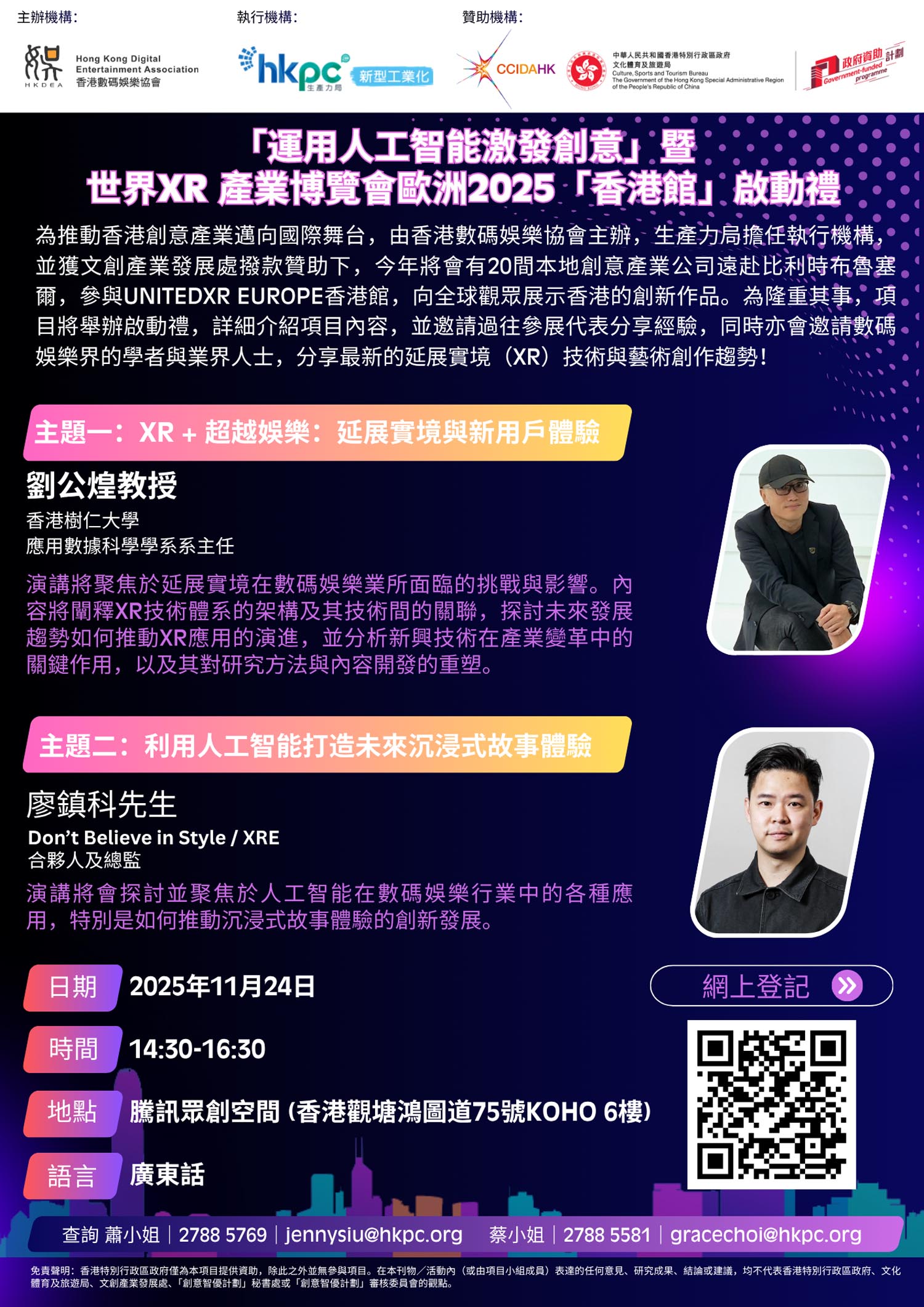 在世界 XR 產業博覽會歐洲 2025 設立「香港館」• 透過人工智能推廣香港創意產業為推動香港創意產業邁向國際舞台,由香港數碼娛樂協會主辦,生產力局擔任執行機構,並獲文創產業發展處撥款贊助下,今年將會有 20 間本地創意產業公司遠赴比利時布魯塞爾,參與世界XR 產業博覽會歐洲 2025 (UnitedXR Europe 2025),透過設立「香港館」向全球觀眾展示香港在人工智能(AI)與延展實境(XR)領域的創新成果與前沿技術。